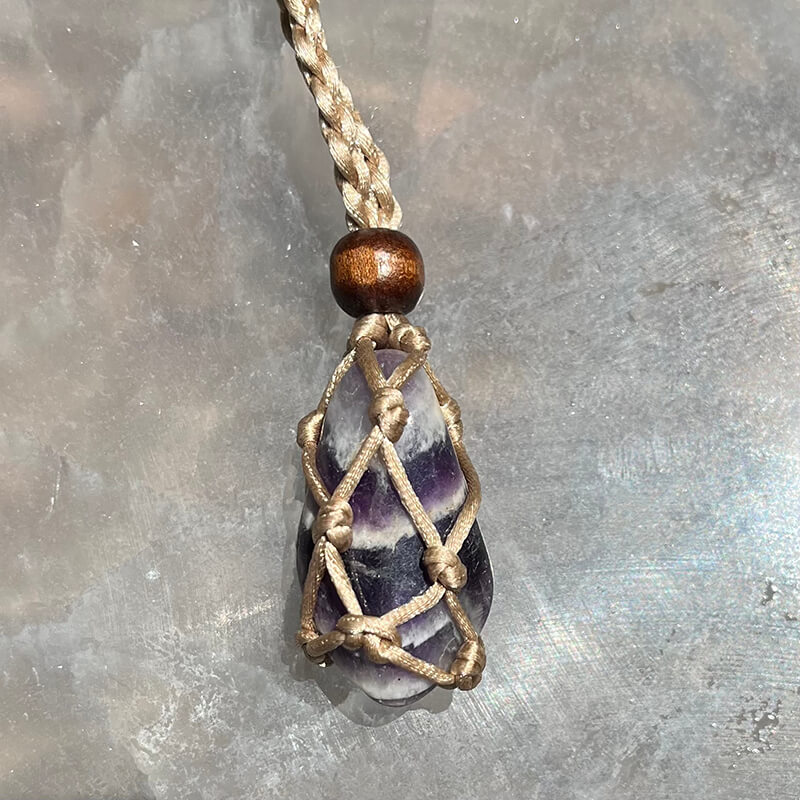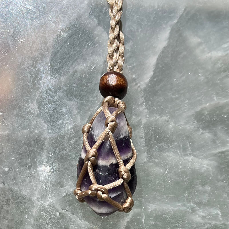 Beautiful Dogtooth Amethyst with khaki cord and handmade crystal holder.