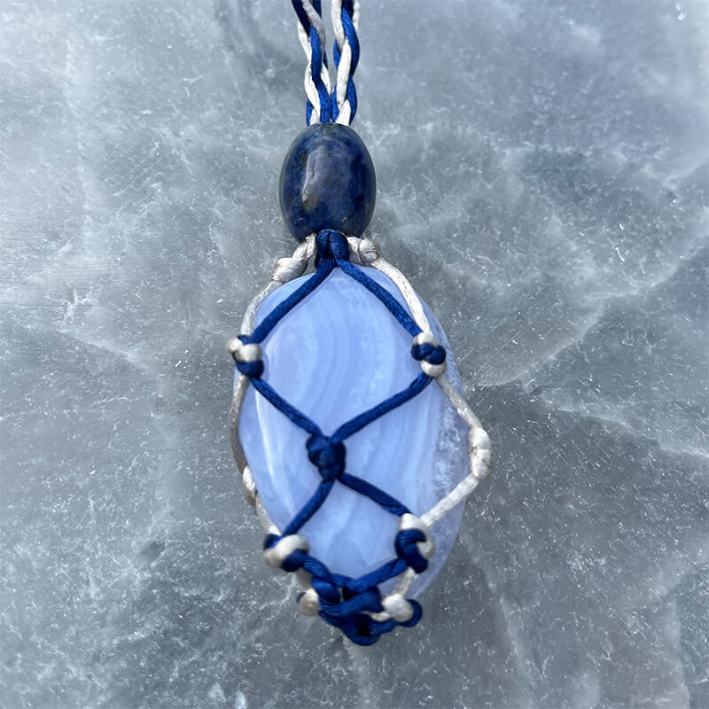 Blue lace agate in a navy blue and silver satin cord crystal holder. Sodalite stone accent bead and adjuster bead. Cord is 30+ inches (can be trimmed to be smaller by you or I if needed). $20